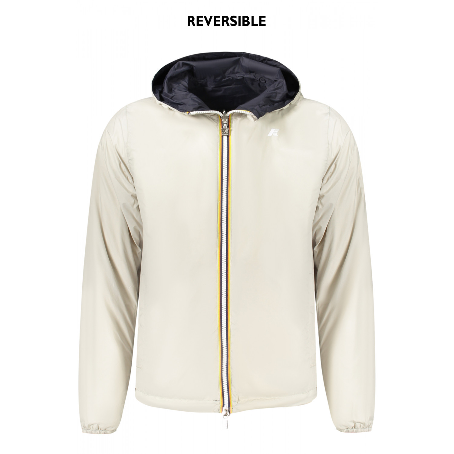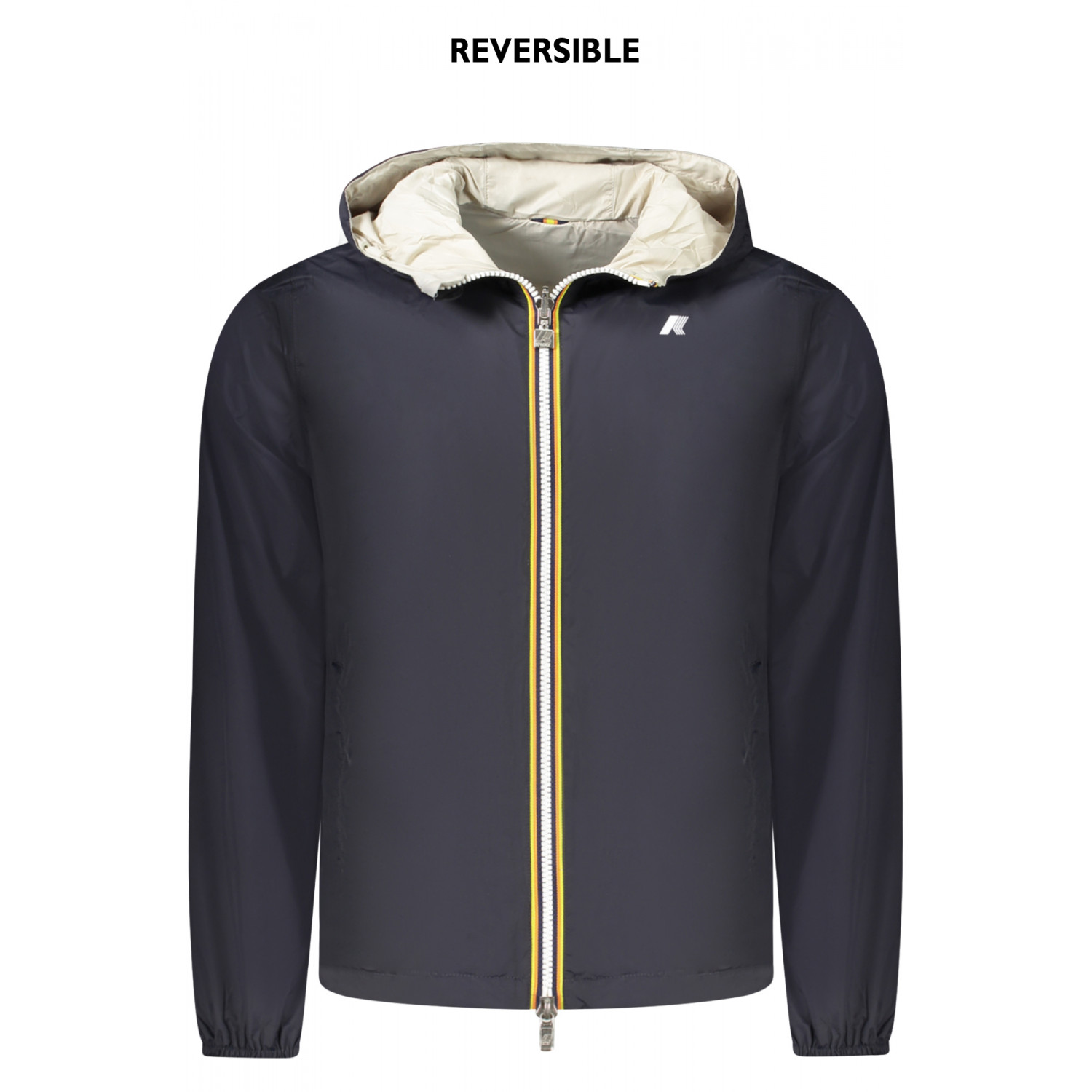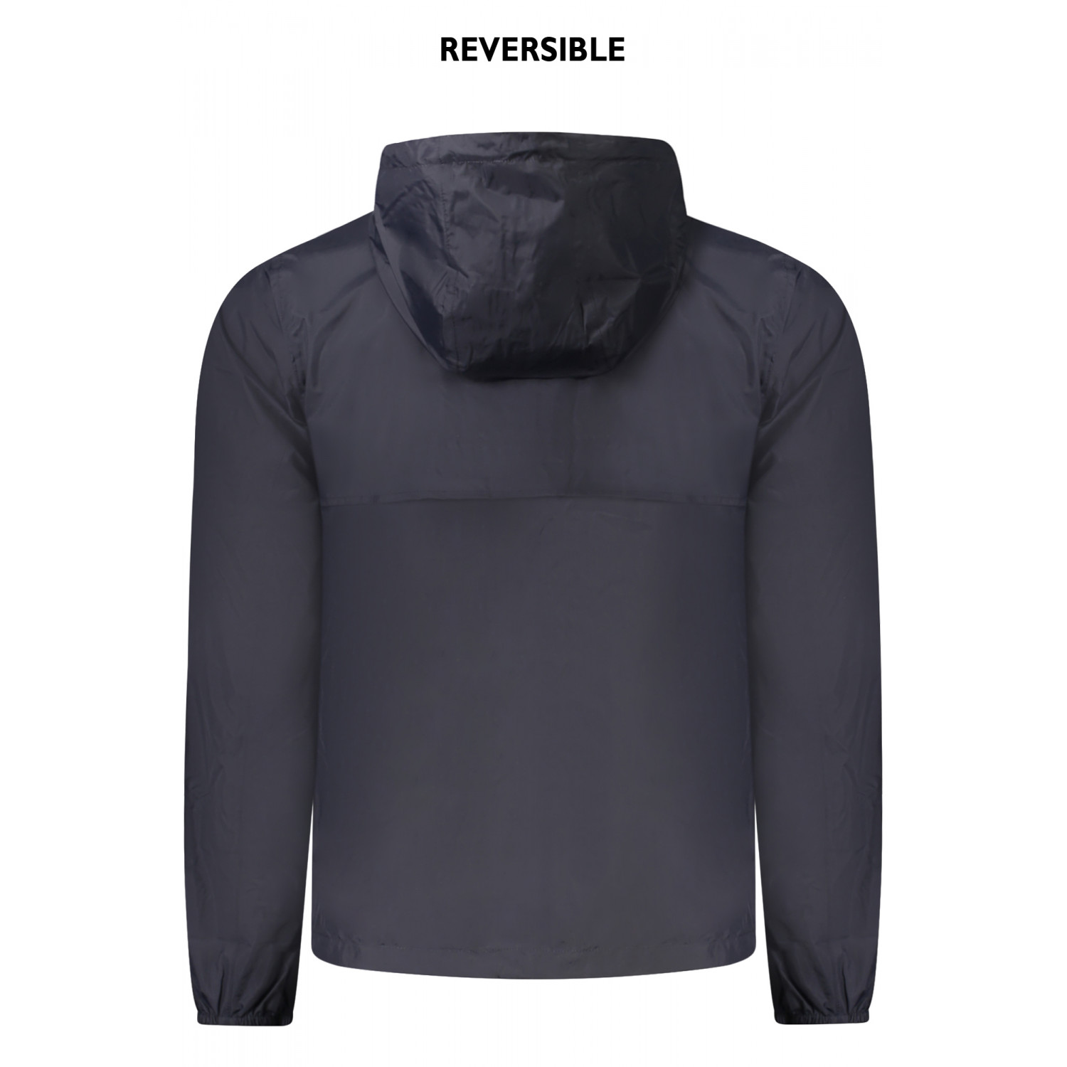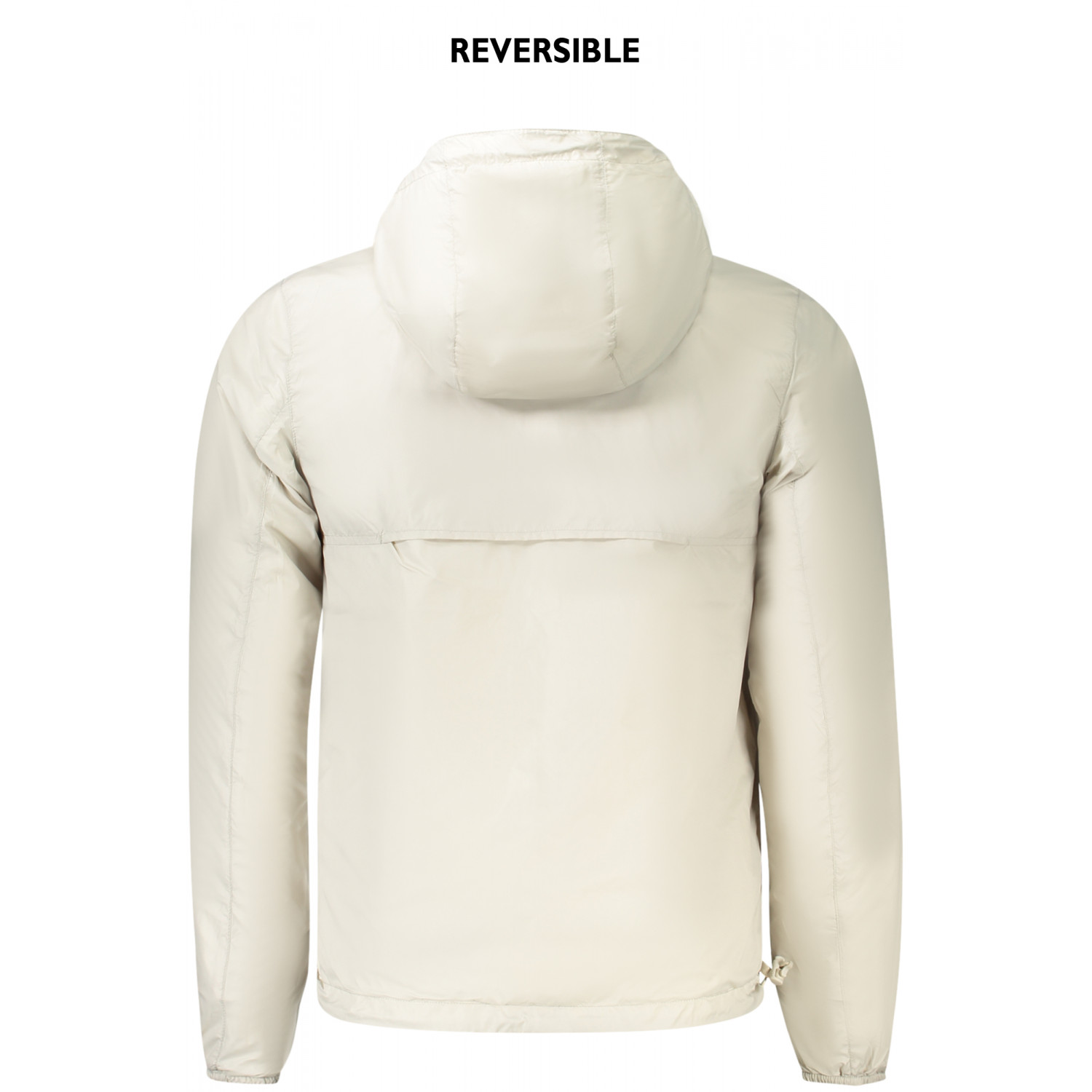 GIUBBOTTO MANICHE LUNGHE CON CAPPUCCIO IMPERMEABILE, REVERSIBILE BLU/BEIGE, 2 TASCHE ESTERNE, 2 TASCHE INTERNE, DETTAGLI A CONTRASTO, ZIP, LOGO, 100% NILON RECYCLED